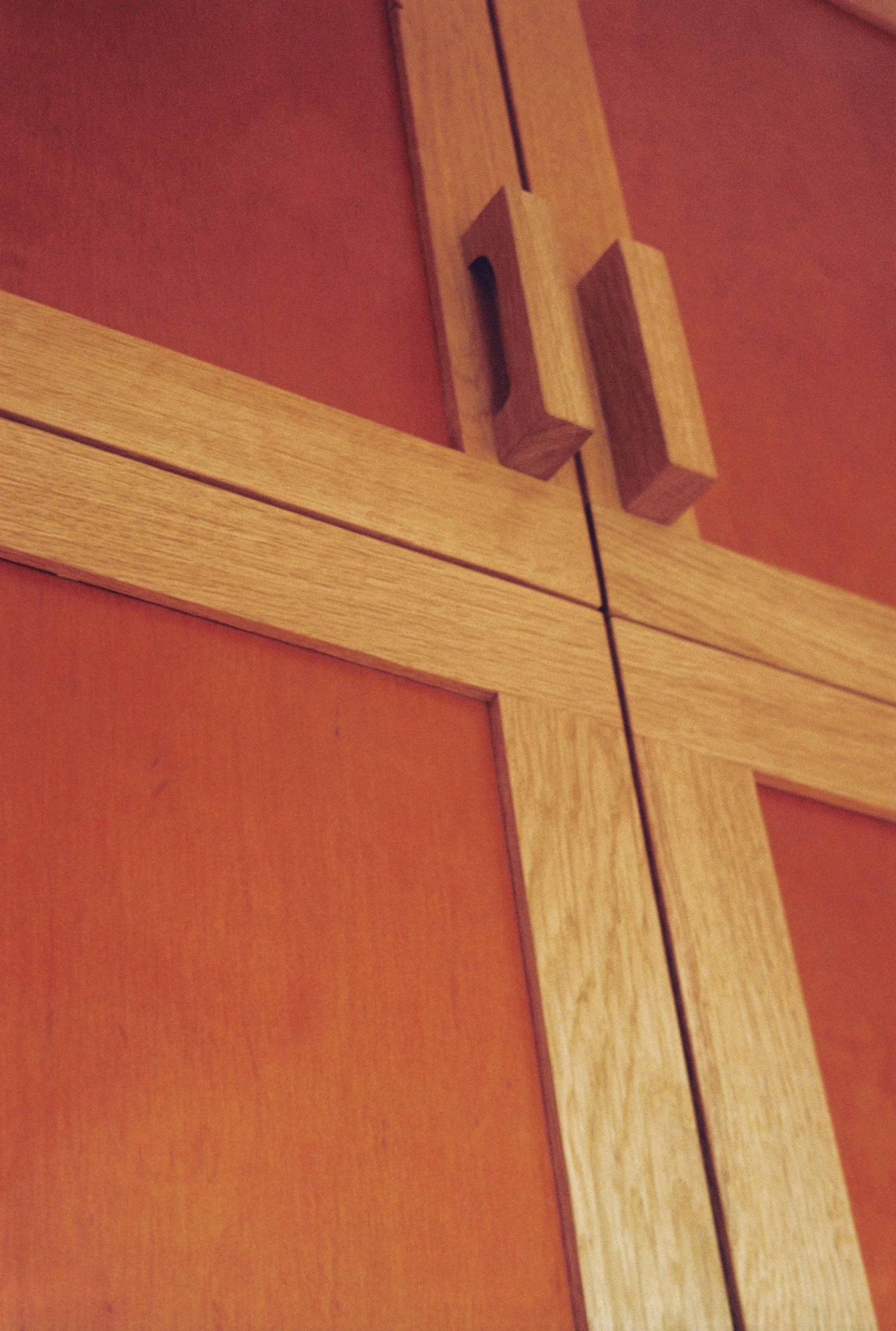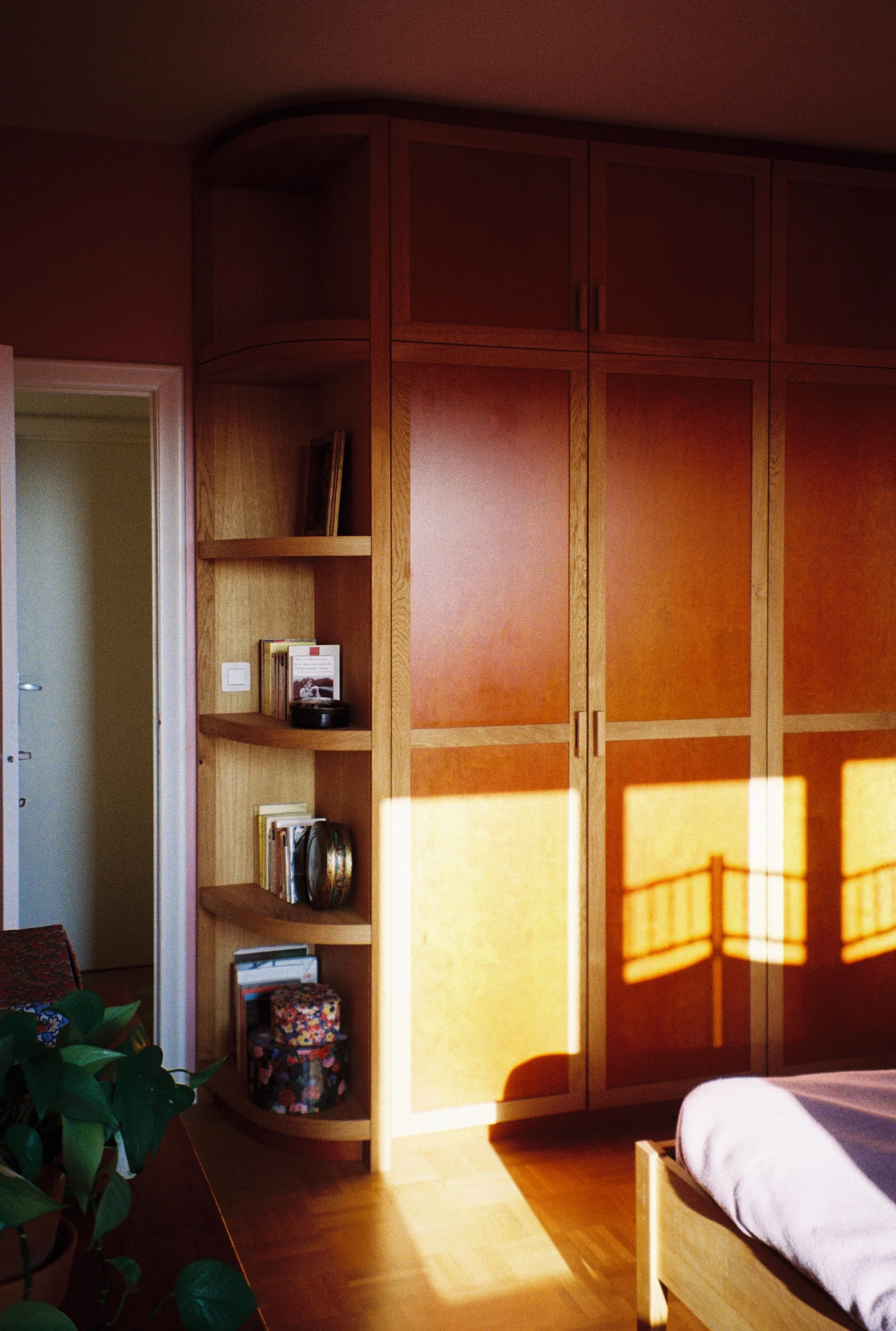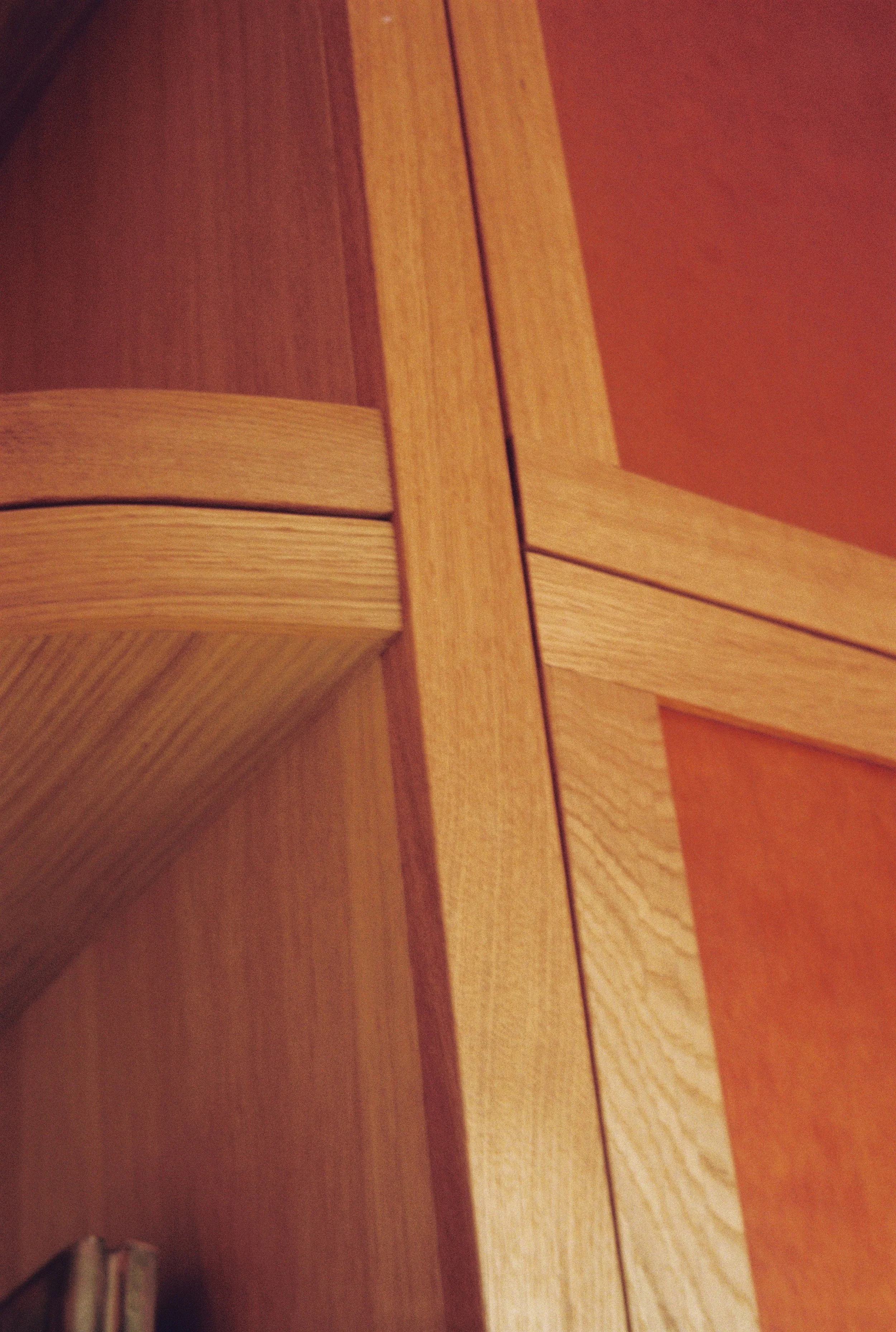 GARDE ROBE DU DOMAINE / 2025Encadrement de portes en chêne massif huilé, panneaux en multiplex bouleau bakélisé brun, étagères courbe avec alaises en chêne massif cintréConception et production : Sarah LEDANT