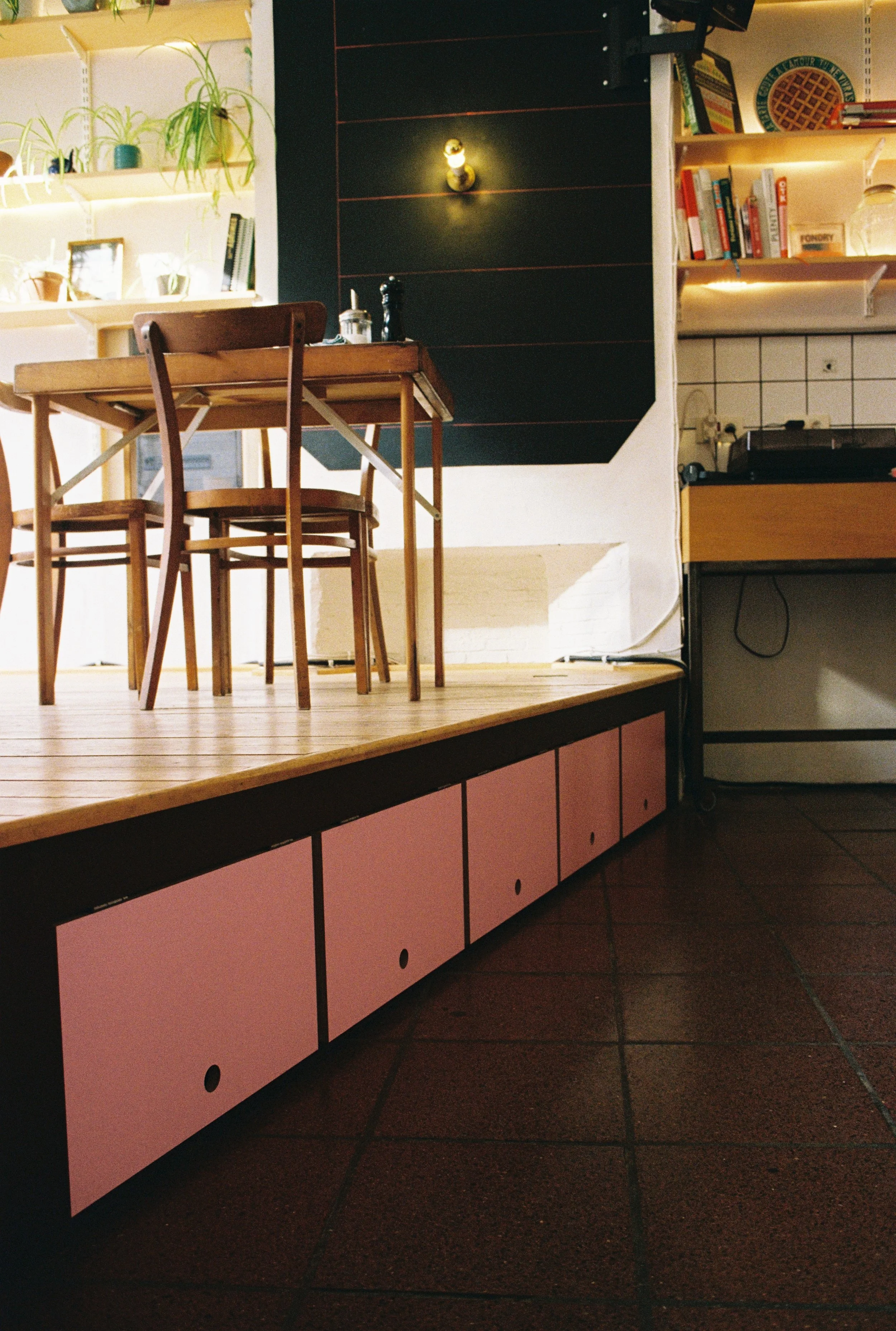 Aménagements d’un restaurant, réalisation d’une scène et de mobilier divers en multiplex stratifié, habillage du bar et de la cuisine en miroirs